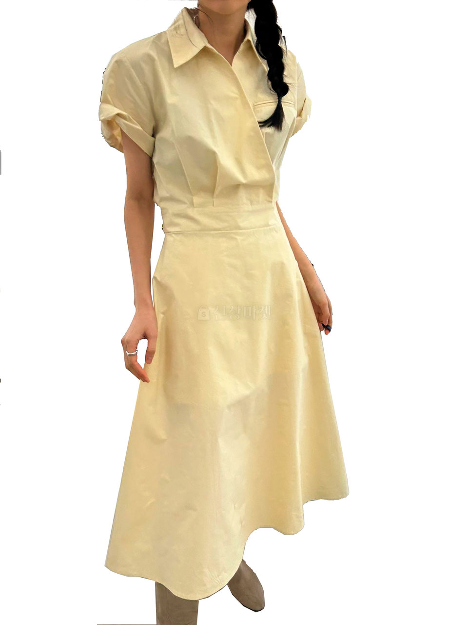 Anders als auf dem Bild hat das Kleid einen eingeschlagenen Kragen mit kleiner Falte vorne.
